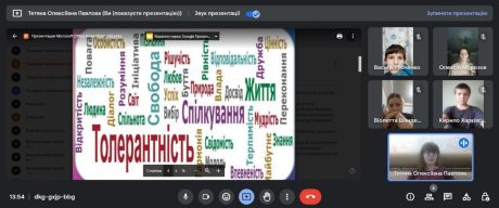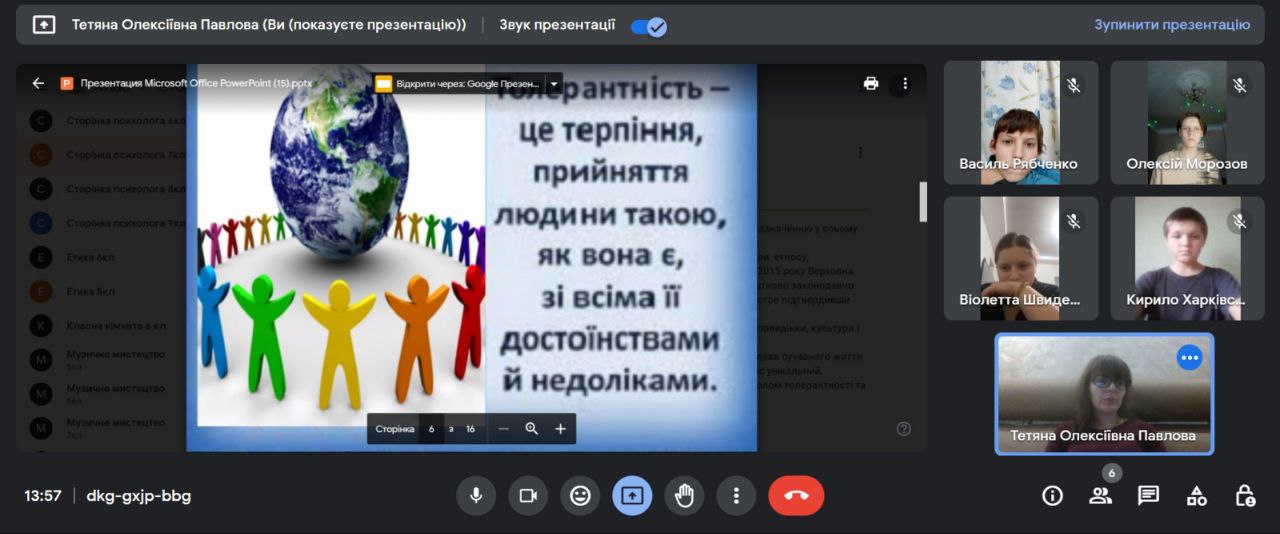 Урок-бесіда “Толерантність у сучасному світі” Мета: провести знайомство учнів з поняттям “толерантність” та основними рисами толерантної та інтолерантної особистості, розпізнати здібності щодо адекватності пізнання себе та пізнання оточуючих людей. Сприяти формуванню цілісних установок на толерантне спілкування та навичок толерантної поведінки, звичок. Виховувати чуйність, взаємоповагу, людяність, терпимість і небайдужість. (7клас)